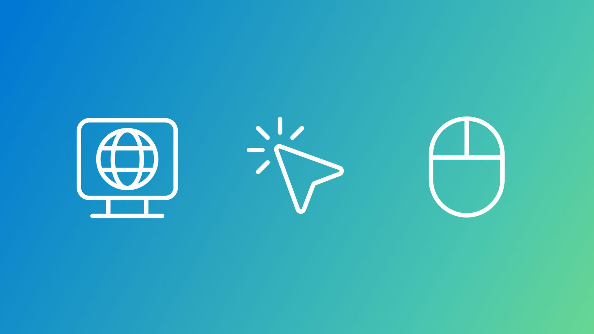 Three white line icons on a blue-to-green gradient background: a computer monitor with a globe symbol on the left, a cursor arrow with click lines in the center, and a computer mouse outline on the right.