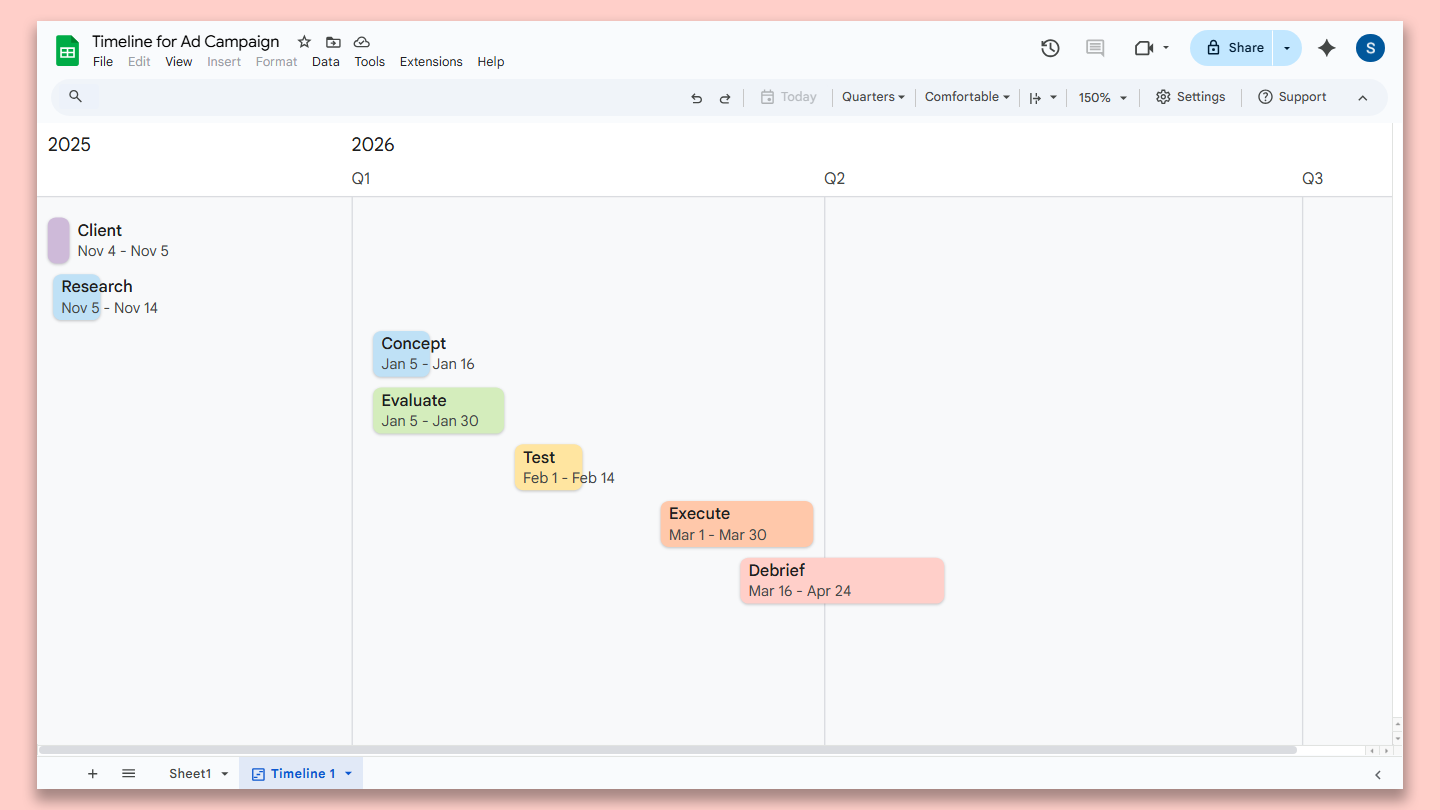 If your team doesn’t need full-blown project management software, Google Sheets is handy for tracking the status of your projects. It becomes even more useful when you use its timeline view.